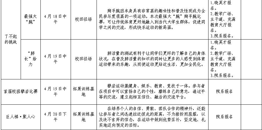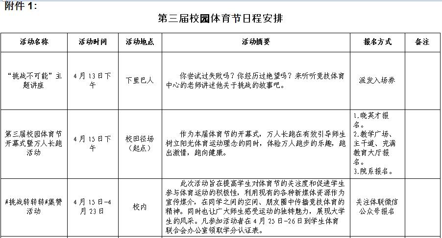 2.体育节期间各项比赛活动的详情及参与方式可参见校内宣传海报及赛事通知。