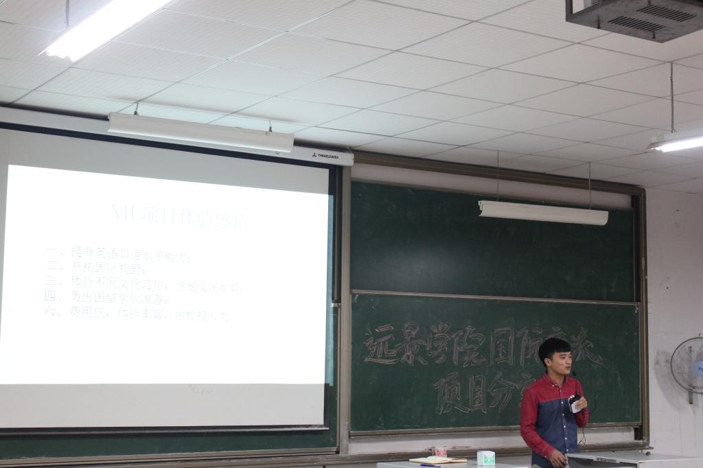 沈涛同学参与的是远景学院北伊利诺伊大学项目,他用一个精心制作的小视频向大家展示了从准备面试,到美国签证以及在美国领略到的风土人情。在谈到个人体会时,他分享了一个自己在美国经历的趣事,在外参观时团队成员错过了回学校的末班公交车,再加上当时天下大雨,团队成员都非常焦急,在最后他们被迫鼓起勇气用蹩脚的英语向停车场的保安寻求帮助,而保安不但没有拒绝,反而非常热心地找人将他们送回了学校,当团队成员想把路费给师傅时,师傅却执意不肯收取,让团队成员感受到了异国他乡的热情。
