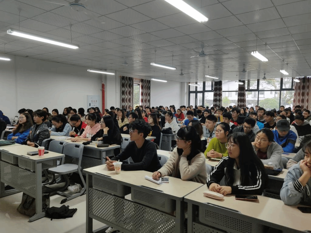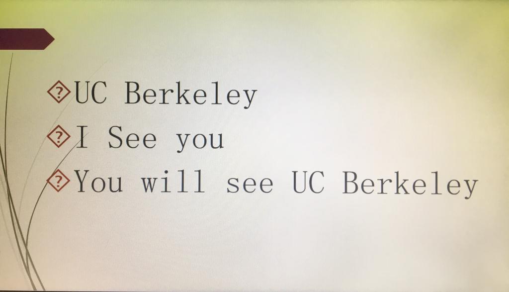 秋日的细雨与凉风阻挡不了同学们的热情,特别是2018级的新同学们,更是早早地来到教室,带着对项目的好奇与敬畏心整齐的坐在教室前段。参与加州大学伯克利分校项目的2017级吴雅倩、候美钊同学,他们通过今年暑期到加州大学伯克利分校的亲身经验来分享两个月的游学之旅。为了帮助同学们更加直观的了解该项目,他们通过现场的讲解和图文的搭配的形式来进行分享。一开始吴雅倩同学就给小萌新们来了一个“下马威”,“繁琐的选拔过程是对同学们身体与心理的重大考验,考验的是同学们的英语能力、创造力与舞台表现力。为期两月的选拔是一场持久战,”但如学姐所讲,这样珍贵的东西是需要时间的累积沉淀出优秀的人得到他。在人生的重大转折点上,竞争才是获得成功的最好途径!忠言逆耳,但全出于肺腑,旨在让同学们认识到天降大任,必先苦其心劳其身。