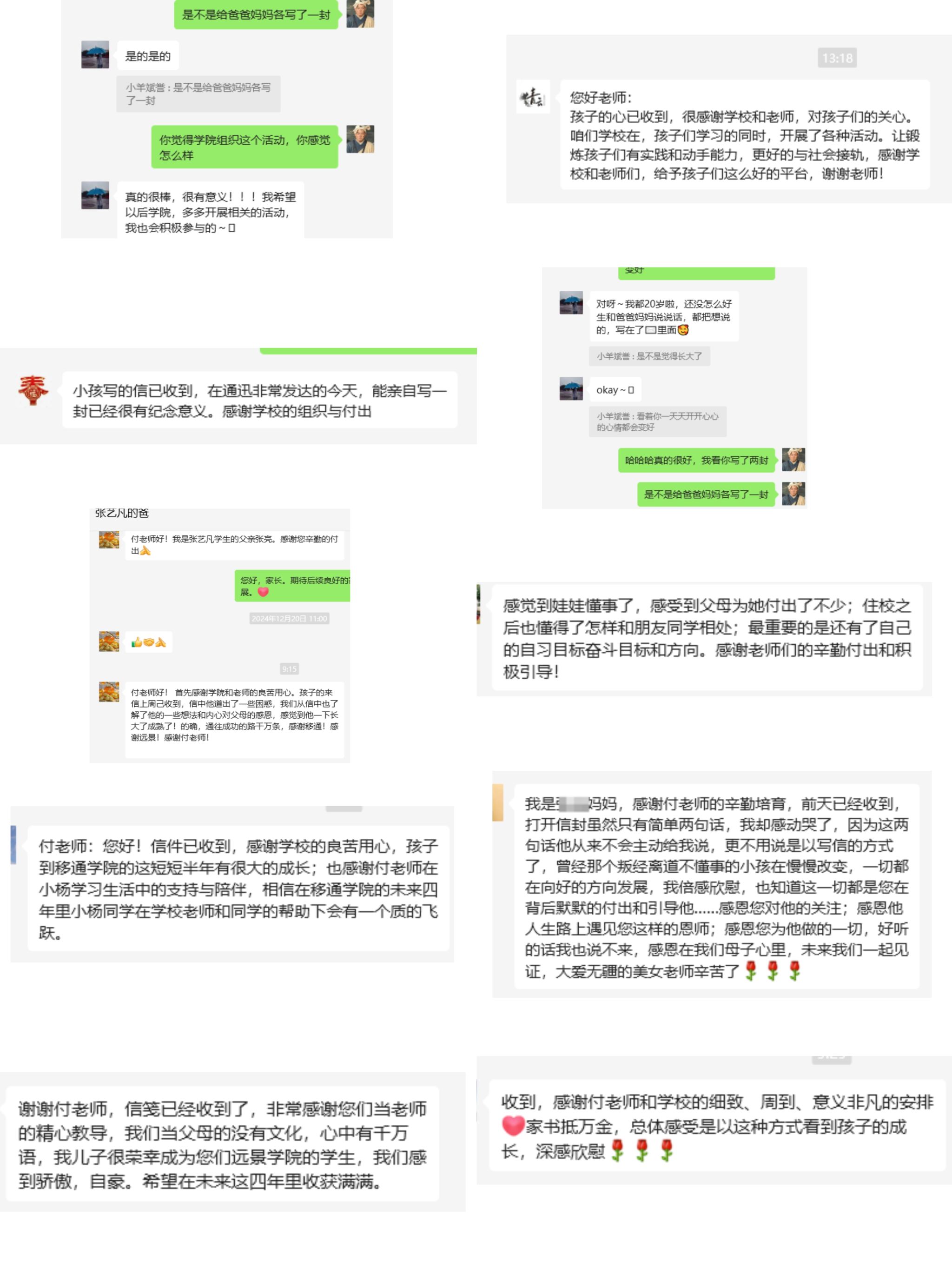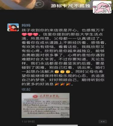 有的家长读完信,立马拨通了辅导员的电话:“老师啊,我家孩子真的长大了,信里说的那些事儿,我都没想到。他在学校的经历这么丰富,我心里非常欣慰。”还有些家长,平时忙工作,和孩子交流较少,这次借着信,才知道孩子心中所想,也表达了对学院举办这次活动的感谢。