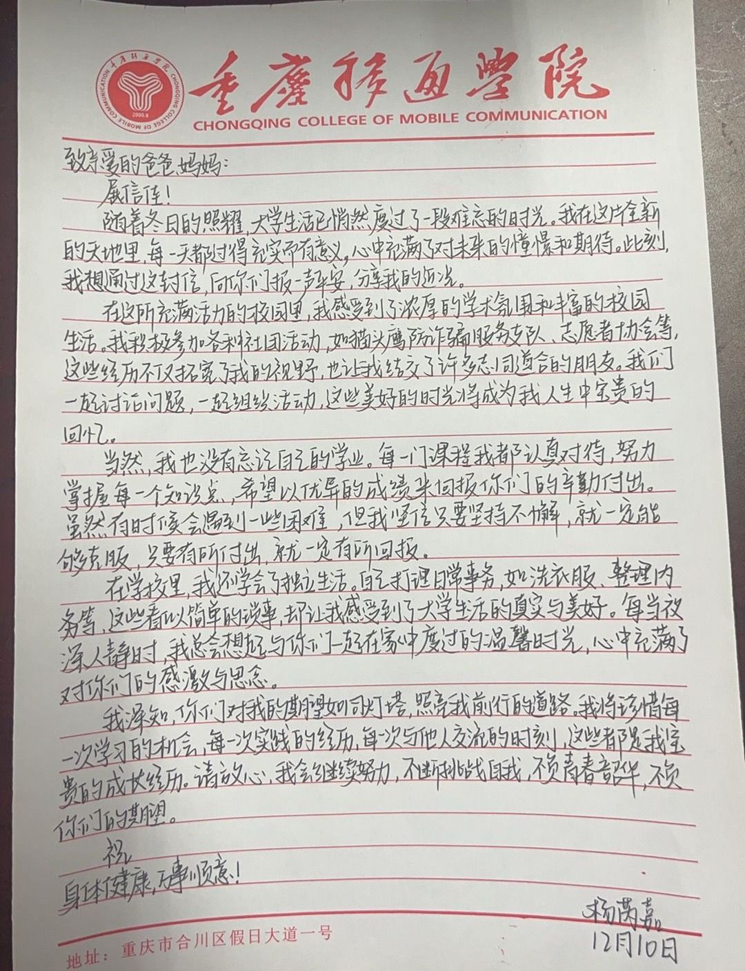 同学们怀揣着各式各样的心情,在落笔之前沉思良久,才开始秉笔修书以传达自己内心的情感与想法。他们会在信中分享自开学以来的收获,比如在大学的第一次比赛中取得了优异成绩,或是成功加入了自己心仪的社团等,这些小小的成就让他们对自己的大学生活充满了信心与期待。他们也会倾诉探索新事物时的好奇与快乐,像是第一次参加清华大学梅赐琪教授的讲座,了解到了通识教育的重要性,那种新奇感在心中不断涌动,促使他们迫不及待地想要与父母分享。同时,外地的同学对家乡的思念也在字里行间自然地流露出来,离开熟悉的家乡和亲人,独自在异地求学,校园里的一草一木、一景一物都可能会勾起他们对家乡的回忆和眷恋。而对父母的感恩之情更是贯穿始终,他们深知父母为自己的成长付出了无数的心血,如今自己能够在大学校园里学习和生活,离不开父母的支持与鼓励,这份感恩之心化作了一句句真挚的话语。此外,他们还会在信中写下一些曾经难以释怀而如今已经想通了的心里话,这些情感在信纸上得到充分的显现,将自己内心的成长与转变毫无保留地展现给父母。