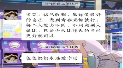 亲子间的线上交流也没闲着,家长们那些鼓励的话,一句句都暖到了孩子心窝里。朋友圈更是成了“亲情秀场”。家长晒出孩子的信,认真的字迹,信纸折出的褶皱,都成了珍贵回忆。同学们纷纷晒出父母的回复,有的是手写的长信,字里行间都是叮嘱;有的是语音消息,那熟悉的声音听得人心里暖乎乎的;还有家长拿着信,读着读着就笑了,眼里闪着泪花,对着镜头说:“孩子,你在学校好好的,爸妈永远支持你。”
