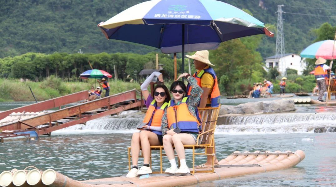 乘一叶扁舟,于遇龙河悠悠而下,看两岸青山重重,云雾袅袅,两岸一派田园风光,赏心悦目。平湖倒影,让人仿佛进入了天人合一的诗意境界,返璞归真的自由天地。竹筏载着学子们在青山倒影的河面上漂流,游览“江作青罗带,山如碧玉簪”;船行江中,宛如迎面打开一幅幅奇妙山水画卷,同学们真正体会到“船在江中走,人在画中游”的绝美漓江仙境;观奇峰倒影、碧水青山、牧童悠歌、渔翁闲钓、古朴的田园人家、清新的呼吸,一切都那么诗情画意。