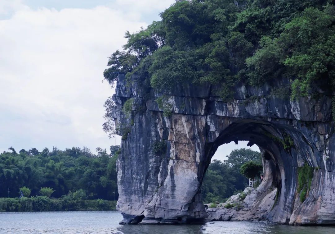 象鼻山是桂林的城徽山,远远望去,这只“大象”正用长长的鼻子吮吸着金坑河的碧水,象鼻和象腿之间是面积约一百五十平米的圆洞,坐落西岸的象山水月与漓江东岸的穿月岩相对,一挂于天一浮于水,形成"漓江双月"的奇特景观。同学们在岸边打卡拍照,欣赏着“象山水月”的奇景,领略江水穿洞而过如明月浮水的美学风貌!