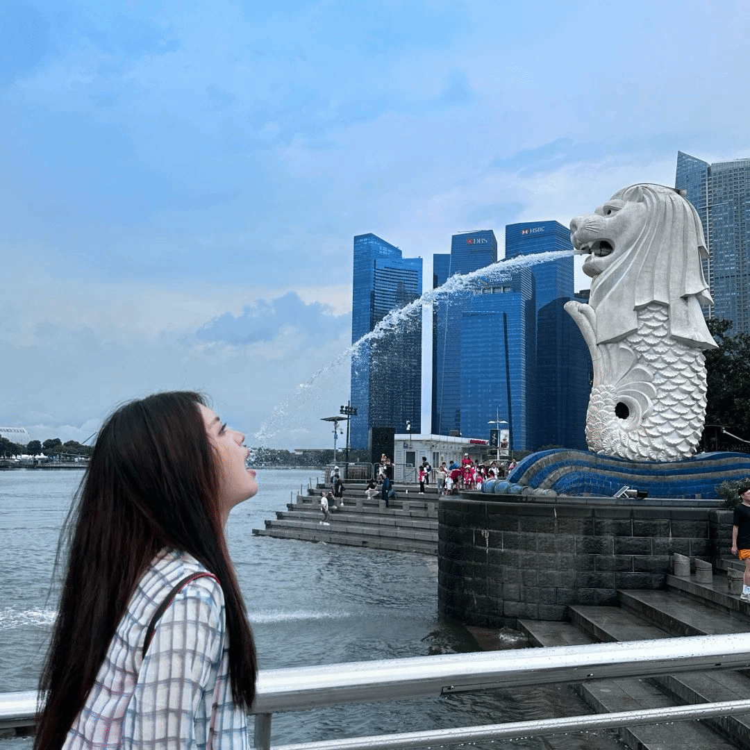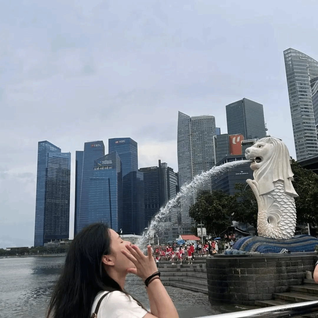 据说,新加坡原名狮城,Singapore是梵语“狮城”的谐音,受印度文化影响,新加坡惯用梵语作为地名,故名新加坡。而这座鱼尾狮雕像是由新加坡著名的雕塑家林浪新先生创作而成,它象征着新加坡这个年轻国家的繁荣与进步;鱼尾狮的形象独特,狮头象征着新加坡的狮城之称,鱼尾则寓意着新加坡是一个海洋国家。同学们以各种的姿势与鱼尾狮合影留念,感受当地的风度人情与城市变迁。