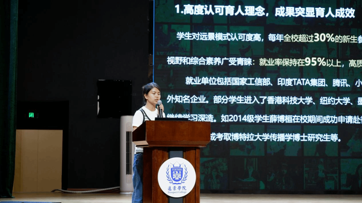 刚从比利时国际交流返校的吴展同学长从“WHO、WHY、HOW、WHAT”四个方面,展示了自己在远景的所学所获,吴展同用流利的英语讲到了自己在远景的成长,远景学院的精英培养让他自信成长。而作为百花奖大众评委的刘力铭学长表示他对远景的一切都怀有满腔热忱,远景让他的梦想得以生根发芽,在学院的国际视野、研学交流、导师制度等的培养下,他的电影造梦之路更加宽阔,圆梦金鸡百花和各大电影节。参加新加坡国际交流项目的张雨婷学姐娓娓道来当初加入远景的原因,讲述了她在远景的成长故事,世间万物,成长最美,她在这种不断打磨塑造自己的过程中,植梦于远景,逐梦于远景。同时还有热爱艺术曾任学校音乐剧A团团长人工智能专业的文茗学长感谢远景学院对他给予的一切支持,远景学院为他提供了一个美好开阔的平台,在远景他实现了玩与学的兼容、快乐且自信的成长。綦江校区的王泓锦、李博文二人集合自己在大学的学习与体验,分享了在远景的点点滴滴以及自己的成长。