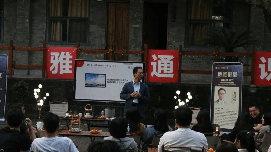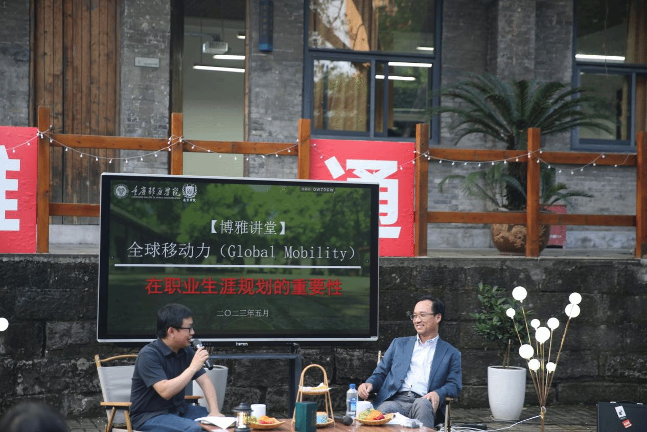 2023年5月23日远景师生齐聚书院菩提树下,召开“博雅讲堂”主题交流,厦门大学嘉庚学院国际商务学院院长苏锦俊教授以“全球移动力(Global Mobility)在职业生涯规划的重要性”为主题与远景师生们交流,专家和同学们围炉于古朴的院落。苏教授不仅在学术研究和人才培养有着丰富的教育教学经历,而且作为上市公司独立董事对于就业创业也有很多实战经验,苏教授将大学生生涯发展的不确定性与职业能力的积累相结合,同时从“全球移动力”概念出发,为同学们做了一次生动的交流,本次讲堂交流由远景学院学工副院长李军主持。