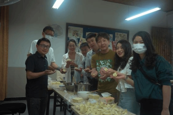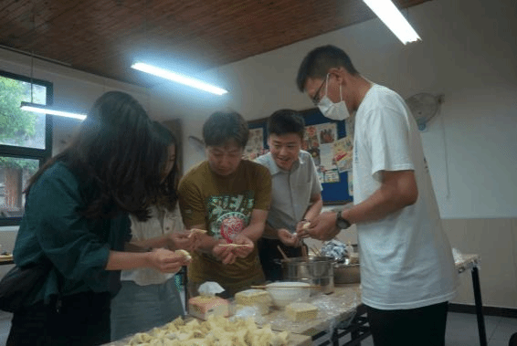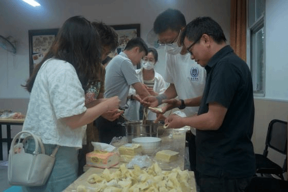 5月7日上午11:40大家齐聚菩提书院教室5一起包饺子,体验大学的厨房时光,十年前的教室变成了十年后的食堂,师生间又体验了一把包饺子的互动。经过前期远景学院同学们的材料准备,校友们、老师们以及同学们一起包饺子,一挑、一捏、一褶,面团和肉馅便成了一个饺子,逐渐地,桌面上出现的越来越多的,花样繁多的饺子逐渐地,有的圆鼓鼓,有的别出心裁,还有的花边饺子让人不禁赞叹校友的心灵手巧。随着锅内翻滚升腾的热气,一个个素白的饺子慢慢上浮,我们的心也慢慢靠近。大家一边品尝自己亲手包的饺子,一边聊天,从生活日常聊到工作学习;从大学回忆聊到最近发展;从远景楼的厨房聊到菩提下的活动,这一幕幕都寄托着校友们对远景深厚的感情。