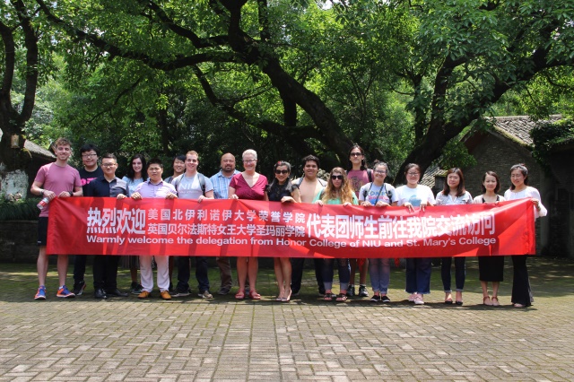 2018年5月24日,美国北伊利诺伊大学荣誉学院(以下简称NIU)第四批和英国贝尔法斯特女王大学圣玛丽学院(以下简称圣玛丽学院)师生第二批代表团应邀如期到访远景学院,为了帮助本次来访的各代表团尽快熟悉校园生活。远景学院于25日在菩提书院教室2举行了隆重的欢迎座谈会。院长关玉琳,国际处张冠阳,教研室主任强杨、李梦瑶,综合办主任曾明珠等师生代表应邀出席,欢迎座谈会由2017级辅导员汪宏宇主持。