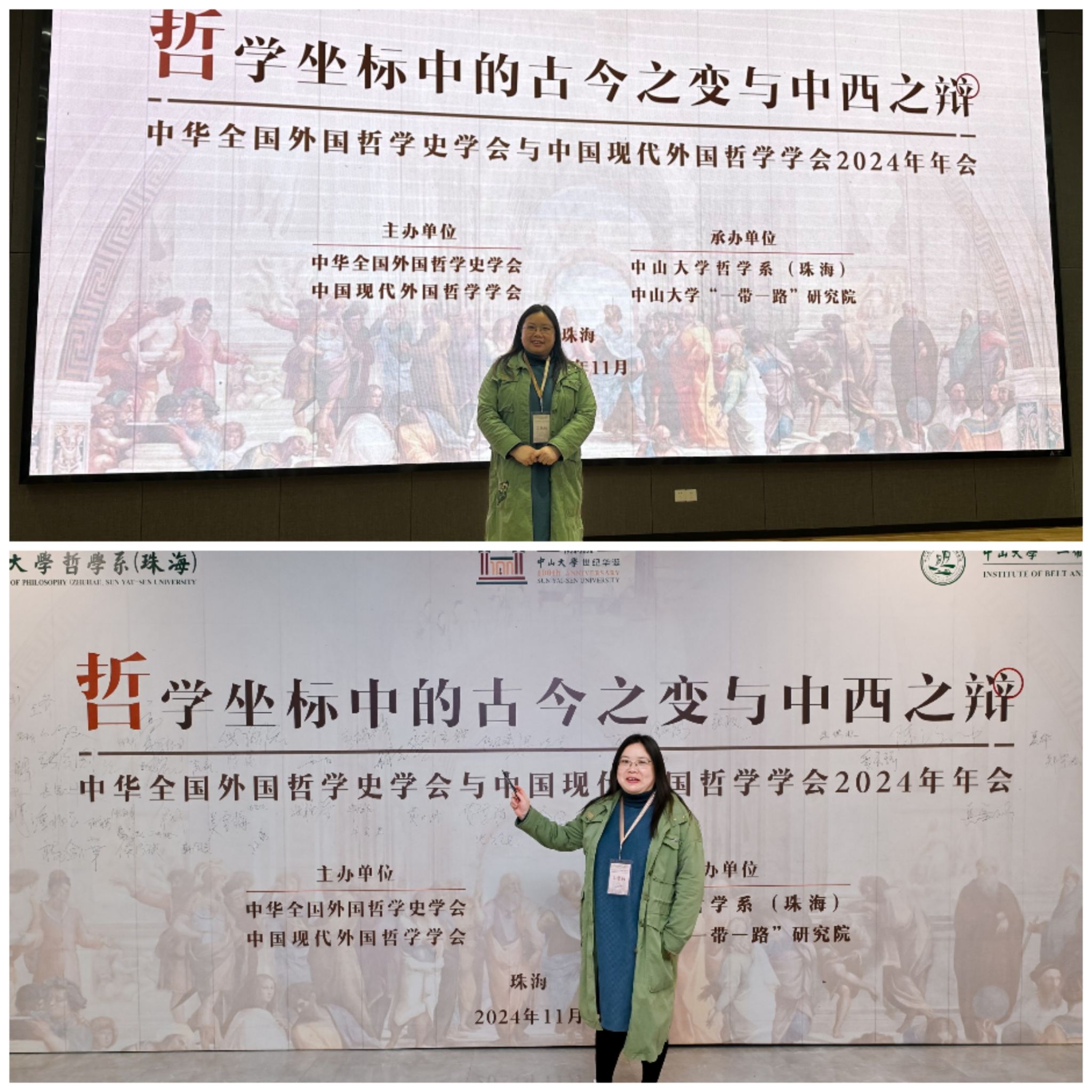 2024年11月23-24日,中华全国外国哲学史学会与中国现代外国哲学学会2024年年会在中山大学(珠海)召开,由中山大学哲学系(珠海)承办,本届年会主题为“哲学坐标中的古今之变与中西之辨”旨在研讨当今全球化和多元文化交融的背景下,探讨哲学的古今之变如何指引未来的哲学发展,以及中西哲学之间的对话与会通,期望推动学术界对古今之变与中西之辨的深入理解,促进文明互鉴与平等对话,共同探索哲学的未来发展方向。国内外众多双一流高校和科研院所,经过论文评审,210余位专家学者受邀参会。远景学院吴慈荷老师受邀参会,并在分会场七“中西哲学比较”做论文报告。