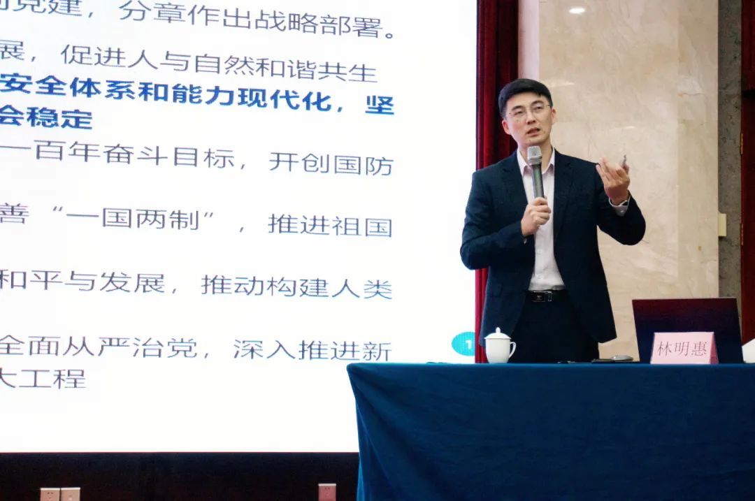 林明惠副教授是来自福建医科大学马克思主义学院的优秀老师,由他带来的《以中国式现代化全面推进中华民族伟大复兴——学习党的二十大精神》培训,主要从“深刻认识党的二十大的胜利召开背景”、“深刻把握党的二十大的主要内容”、“深入学习贯彻党的二十大精神”几个方面来进行深度解读,林副教授用案例解读、影视资料、现场互动等多维度的讲授形式,让奋斗一线的教师们更加意识到党的二十大报告的内容重要性,并进一步加深了对党的二十大传递的精神的理解。