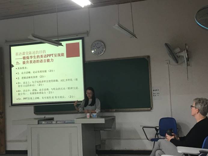 黄煌老师在《大学英语》中实施的课堂陈述,主题来自4、6级、雅思、托福的英语写作或者口语话题。通过课堂陈述,帮助学生提升英语口语表达能力以及用英语语言传达自己观点的有效性。为了保证效果和陈述质量,黄老师制定了“精细”的评分原则和操作规范,如strong argument and clear supporting evidences;coherent logic;Grammatical Accuracy and Lexical resource;fluency and the interactions with the audience;The PPT arrangement等。学生在思考 “怎样才能得高分?”的同时,也在被引导,有目标的思考和准备自己的陈述,如PPT的制作和英语语言表达的设计,自己的观点传达是否到位,怎样才能为听众所接受和理解等等,最终实现英语学习能力的提高。