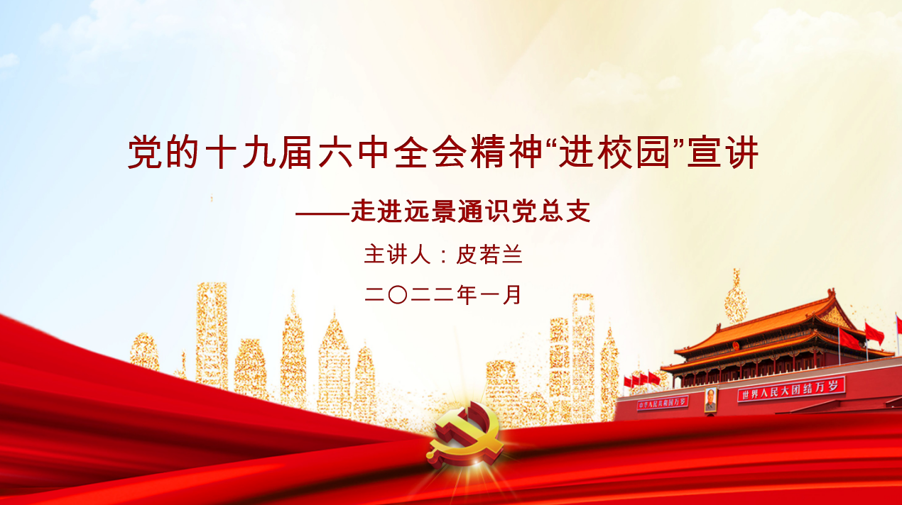 为深入学习宣传贯彻党的十九届六中全会精神,深化拓展党史学习教育,根据市委教育工委印发的《党的十九届六中全会精神“进校园”宣讲工作的通知》,结合《重庆移通学院党的十九届六中全会精神宣讲工作方案》,2022年1月6日15点30分,远景通识党总支在汇江楼107会议室开展“党的十九届六中全会精神进校园”宣讲活动,由远景通识党总支书记皮若兰同志主讲,远景通识党总支师生党员代表参与了本次活动。