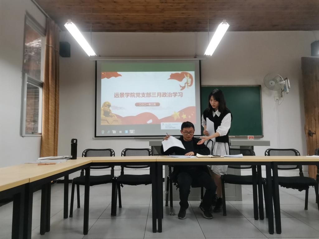 为学习贯彻习近平新时代中国特色社会主义思想,党的十九届五中全会精神。2021年3月17日下午16时,重庆移通学院远景学院党支部在菩提书院教室五开展2020年度党员民主评议大会暨3月党支部政治学习。本次会议由党支部支部书记李军主持,党支部副书记吴慈荷、党支部宣传委员郭淼等14名正式党员以及周雨婷等3名预备党员参加了本次会议。