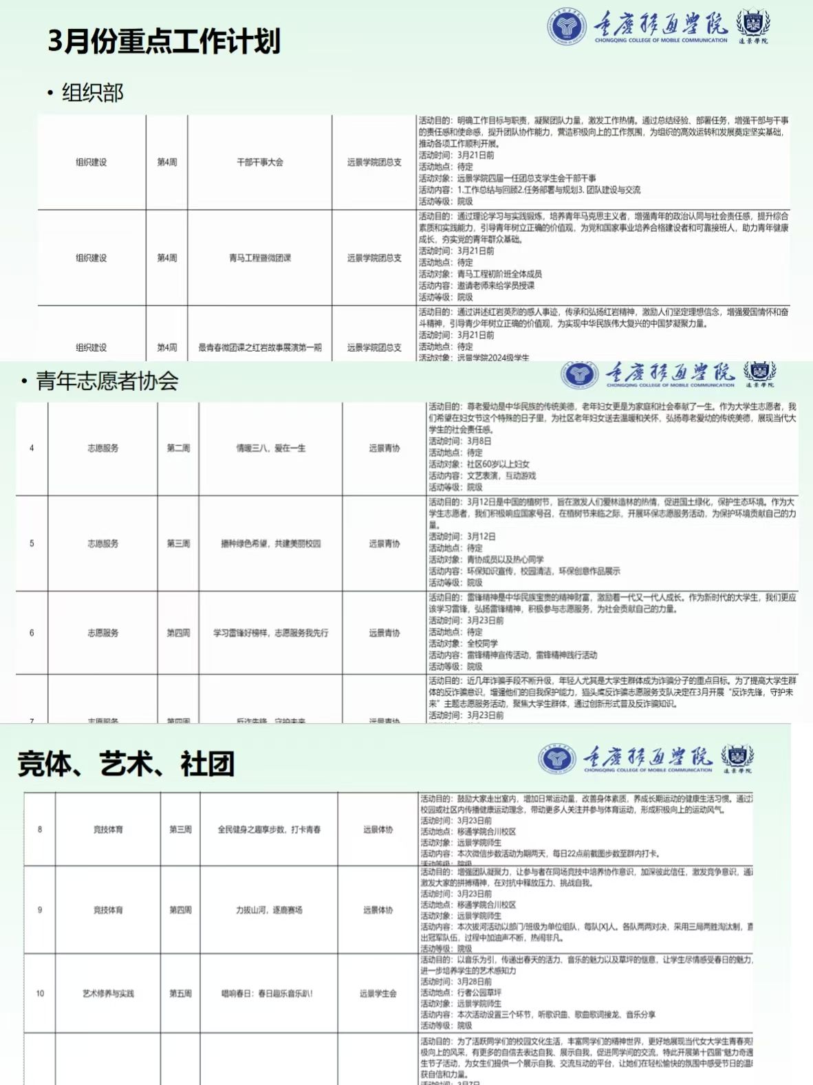 在会议中,周义巧老师对三月份的工作进行了详细的安排部署。她指出,三月份是新学期的开始,团总支学生会要紧跟学校步伐,通过党建带团建,积极开展各类团学活动。她具体介绍了即将开展的几项重点工作,包括基础团务的开展、志愿服务活动的组织、学生社团的建设等。她要求各部门要明确工作目标,制定详细的工作计划,确保各项工作能够顺利开展。同时,她还强调了部门之间的协作与配合,希望大家能够团结一心,共同完成各项工作任务,形成工作合力,为学校的发展和学生的成长贡献力量。