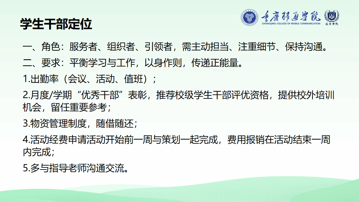 随后,周义巧老师着重强调了学生干部的规章制度。她指出,学生干部作为学生中的骨干力量,不仅要在学习和生活中起到模范带头作用,更要严格遵守学校的各项规章制度。她详细说明了学生干部的职责和权利,要求大家在工作中要做到公平、公正、公开,切实维护广大同学的利益。同时,她还强调了学生干部的纪律性和组织性,要求大家要严格遵守团学的工作纪律,按时参加各项会议和活动,认真履行自己的工作职责,以高度的责任感和使命感推动团学工作的开展顺利。