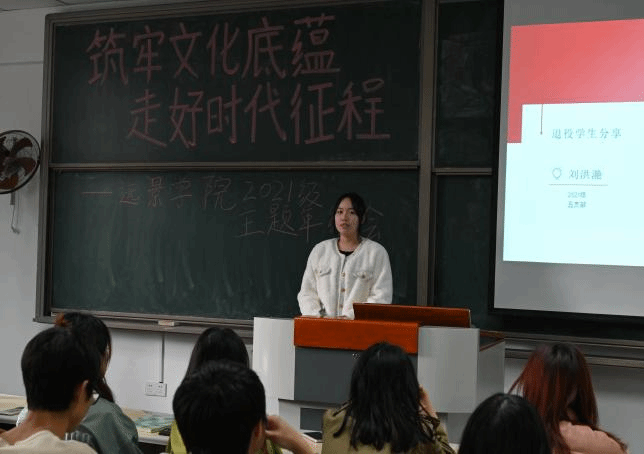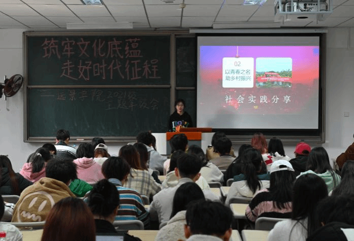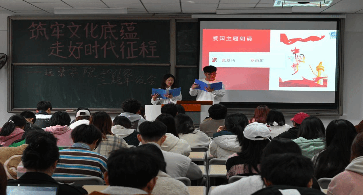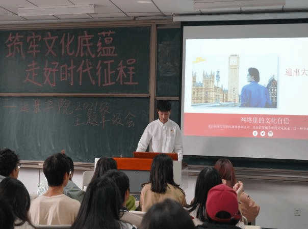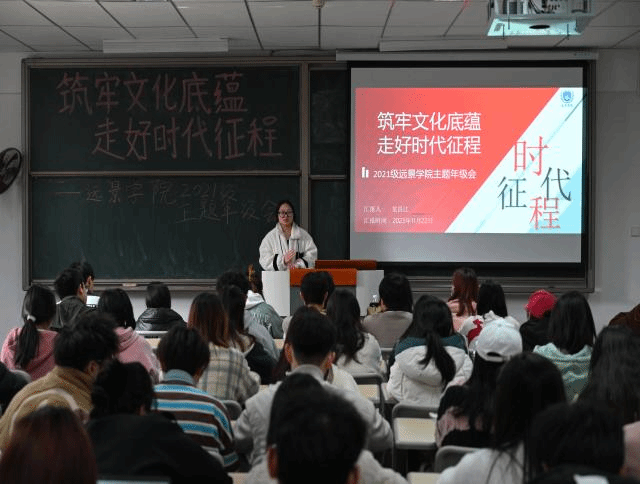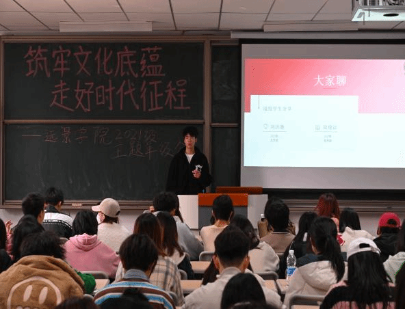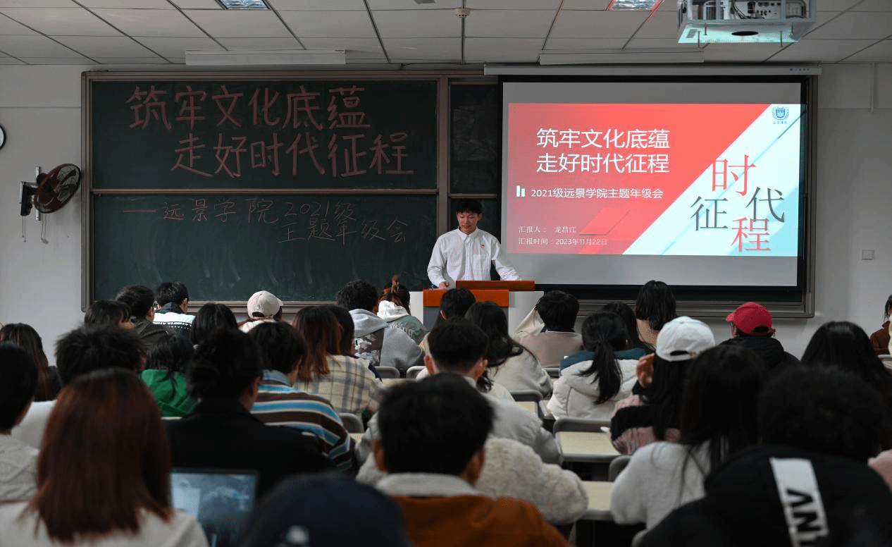 中华文明源远流长、博大精深,是中华民族生生不息、发展壮大的根源,也为人类文明进步作出了重大贡献。习近平总书记在党的二十大报告中作出“推进文化自信自强,铸就社会主义文化新辉煌”的重大部署,提出“增强中华文明传播力影响力”的任务要求。为进一步增强使命感责任感,远景学院2021级于11月22日13:00在9204举行了以“筑牢文化底蕴,走好时代征程”为主题的年级会。本次活动邀请到了远景学院辅导员王语婷老师、远景学院2023级4支部安全委员陈雯婧以及两名退伍复学的同学刘洪滟、陆俊洁。主持人是2021级英语专业的龙昌江同学,2021级全体同学参与了此次会议。