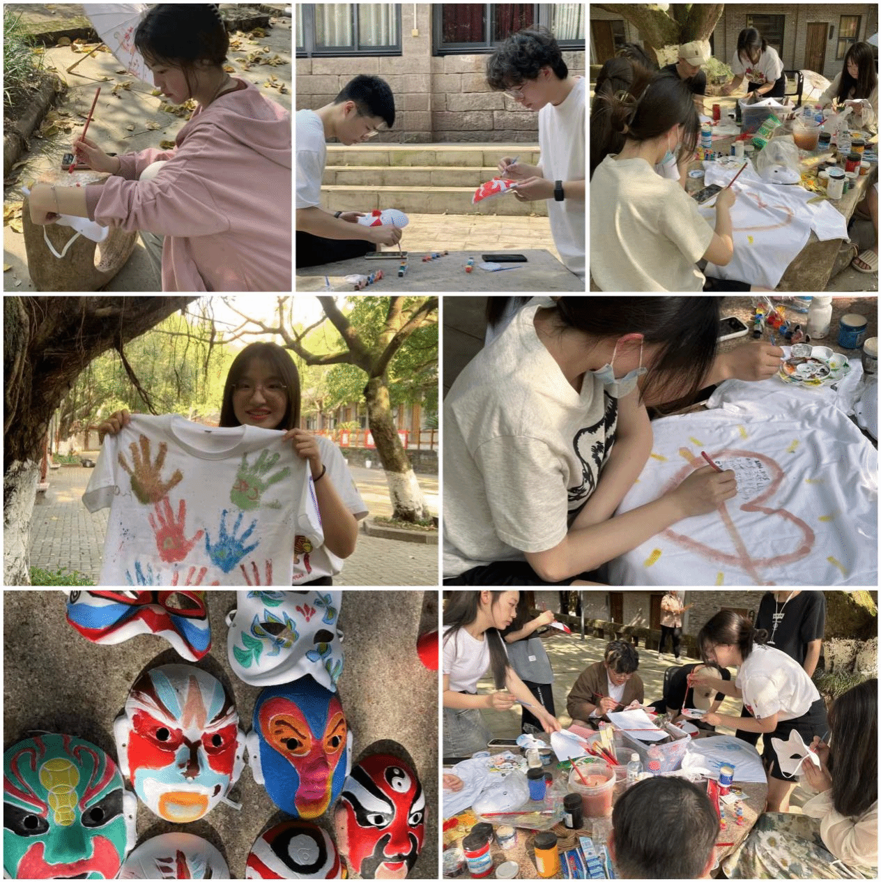 “蓝脸的都尔敦盗御马,红脸的关公战长沙”出自歌曲《说唱脸谱》,这是一首耳熟能详的京味歌曲。京剧是我国的国粹,具有深厚的历史底蕴和丰富的文化内涵,“以形传神,形神兼备”,深受国民喜爱。同学们用五颜六色的颜料给白色面具上色,戴上一次性手套给T恤盖掌。同学们笑着、闹着,不知不觉间时光也悄悄地溜走了。在欢声笑语中作画,不仅让同学们清晰感受到国粹的美丽,开拓对中华传统文化的见解,还在一次次游戏中切身体验了传统文化及相关活动的独有魅力,升华自己的爱国情感,从而增强文化自信。