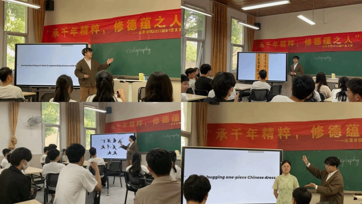 武术、旗袍、汉字......都是中华的传统文化,其中一种是传承自古代军事战争的技术,是一种以中华文化为理论基础、以技击方法为基本内容的传统体育,通过同学的讲解,大家对于中华武术有了更加深刻的认识;而旗袍则体现了中华女性的知性美,通过对旗袍的讲解同学们更加了解了中华之美,而作为汉字更是历史悠久,多种书法字体既体现了中华文化的兼容并包,也体现了中国历史的源远流长。