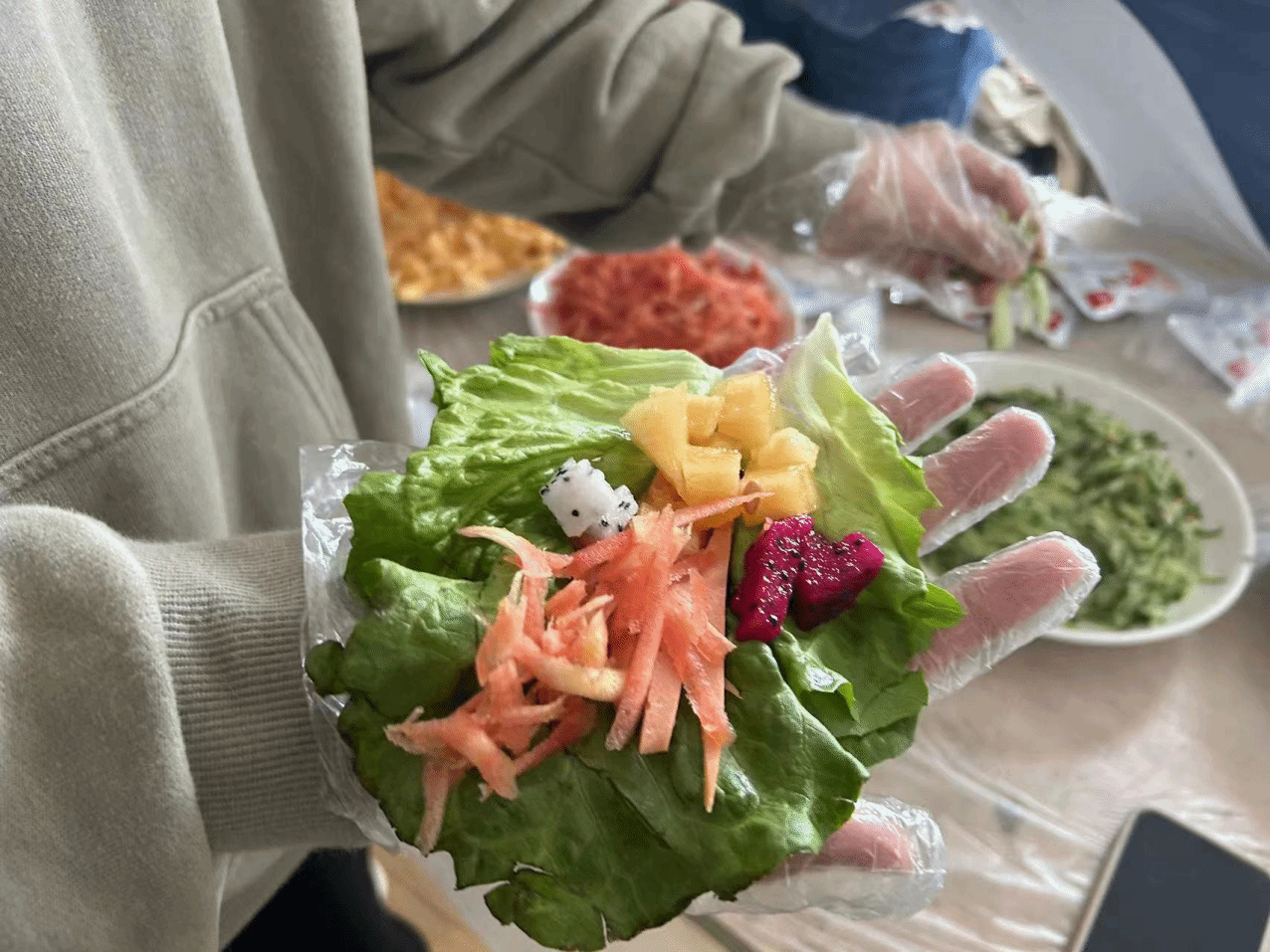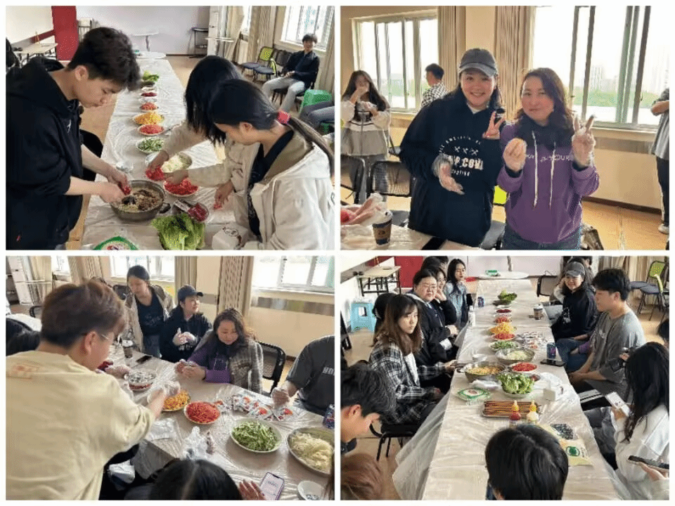 在“春卷制作”环节中,同学们可以根据现场自己喜欢的口味、食材来制作自己独一无二的馅料。大家纷纷动手,亲自diy独属于自己的春卷。两位老师也和同学们一起制作美食、品味美食、感受文化。与其说是老师和同学们一起感受美食,学习文化,倒不如说是一群趣味相同的朋友聚会聊天,彼此分享快乐。大家在制作春卷中,相互交流,相互探讨,平时学业、自身的烦恼此时仿佛全部消散。欢笑声从房间里传到远方。春卷的制作仿佛在感受中国传统文化魅力,体验古时人们的乐趣。