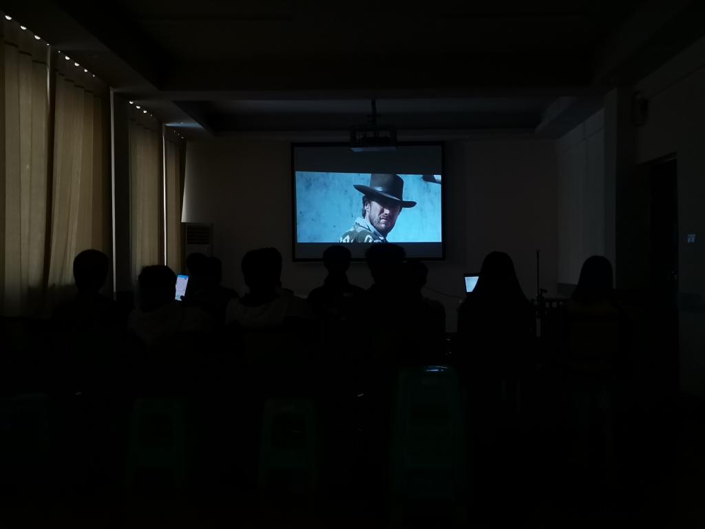 在社长积极带动下,大家在观影过程中,踊跃地表达自己的情感和想法。这一次我们没有选择一线大片,而是选择了经典的西部老片。经典之所以成为经典,正是因为它展示给我们特殊时代下不可替代的角色和故事。《荒野大镖客》主要讲述了墨西哥边境小镇来了一位大镖客,他得知镇上势不两立的两大帮派罗霍兄弟和镇长巴克斯特相厮杀已久,便决定与两派斡旋,除去镇上恶势力,恢复小镇的平静。在社长的讲解下,同学们能够更好的从时代背景、电影音乐、人物刻画方面理解电影蕴含的西部精神。也不知不觉中锻炼了表达能力。