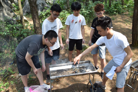终于,来到了石林,找了个宽敞的聚集点,同学们一一放下行李,席地而坐,整顿身心,待凉快下来,每个人又精神焕发,笑颜重生,开开心心准备烧烤。同学们选择了一个适合烧烤的地点,开始进行分工,做准备工作,生火的,铺野餐垫的,准备食材的,同学们都非常积极,配合默契,对烧烤充满期待。