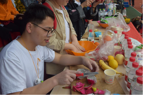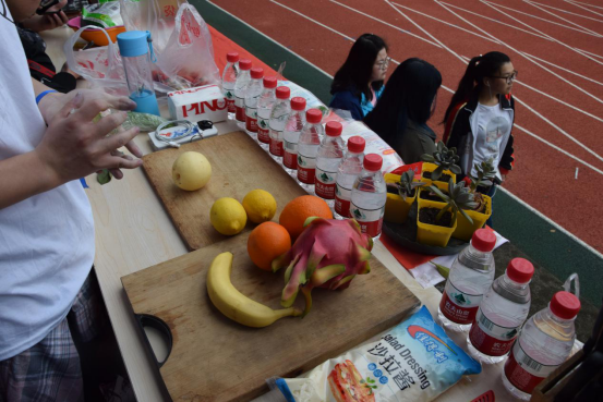 运动会开始后,社长干栋桢带领两位社员开始制作,将菜板和小刀摆放好、水果洗干净、桌面收拾整齐。然后,开始进行水果削皮、切块、摆盘、榨汁等,分工井然有序,有着很好的默契。苹果、香蕉、火龙果、圣女果等,很快一盘盘漂亮可口的水果沙拉就做好了,一字排开,迎接着运动健儿们的勇敢归来。