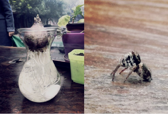 重回菩提树下,社员们将自己增加了“生命值”的植物又乖巧地排列放好。其中,一位男同学为自己水培的风信子还特意买了一个漂亮的透明瓶,风信子白色的根须与瓶子完美的瓶身相得益彰,非常好看。他分享到:“通过社长的教授和我自己查找的资料,我了解到了风信子的习性,所以我根据它的习性和生长习惯,每隔一段时间就给风信子换一次水,然后去观察它有没有什么变化,还给它买了一个很好看的水培瓶,每当看到它长高了一点儿,我就觉得特别高兴,一种自豪感油然而生,就期待着它什么时候能够开花。”此番让很多同学对他刮目相看,很难想象男生竟然也会如此宠爱自己的小盆栽,从他的眼神和话语中同学们也感受到了他对自己亲手培育的植物的那份喜爱,以及自己精心呵护得到回报后的快乐。此时,恰巧木桌上一只正在爬行的迷你蜘蛛吸引了同学们的注意,每个人都用好奇的目光观察着,与木桌上的植物相对比,两者一动一静,还有几分乐趣。菩提院子里的自在交流,欢声笑语,颇有一番“看庭前,花开花落。观天外,云卷云舒”的韵味,真的很美好。