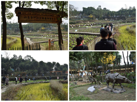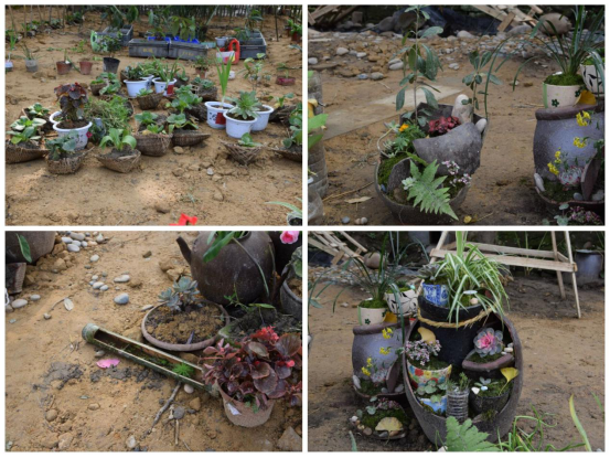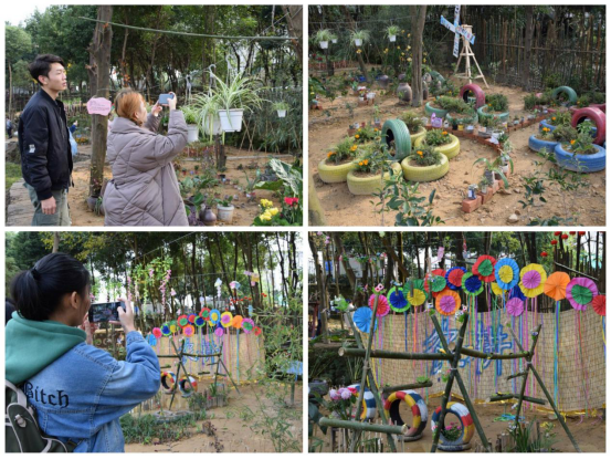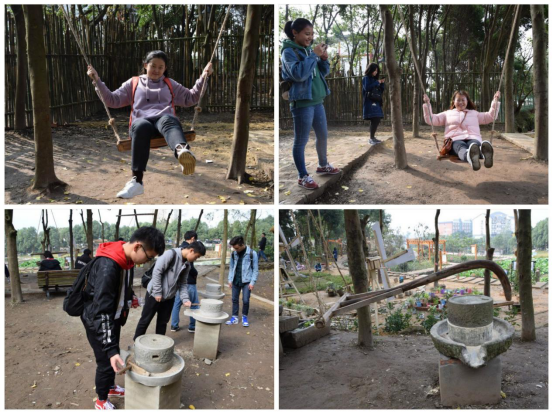 一路上,同学们有说有笑,互相寒暄着,其乐融融。到达育才学校旧址附近,碰巧遇到了当地举办的农耕文化展示,看到生机勃勃的梯田,绿油油的蔬菜,同学们很是兴奋。沿着田坎一边走着,不时驻足细看,并用相机记录下了田野生机,不禁感叹着大自然的美丽与劳动人民的智慧。在梯田里,有的还经过特意设计,废旧物品制作的花盆,五颜六色的鲜花儿,奇特造型的摆放……让原本单调的梯田变得丰富而美丽,一股浓浓的农耕文化气息向同学们扑面而来。更特别的是,梯田里还摆放着农耕人民常用的石磨与用来捣辣椒的木臼等农作工具,同学们看着新奇,产生了极大地兴趣,迫不及待地自己上手,感受了一下干农活,着实有趣。一旁的秋千,也勾起了同学们对童年的回忆,只见他们都像个孩子一样在秋千上荡啊荡,笑啊笑。