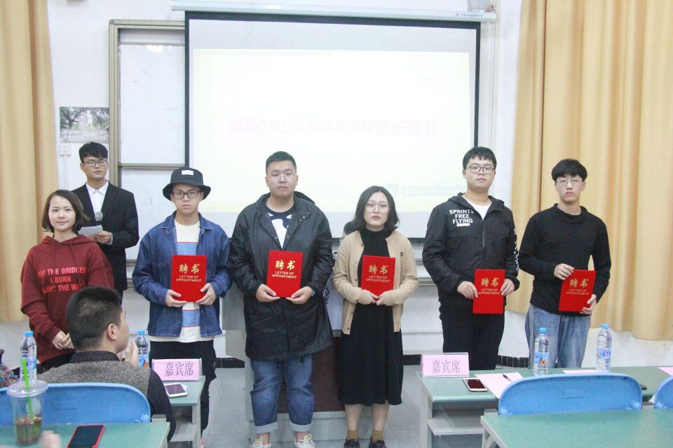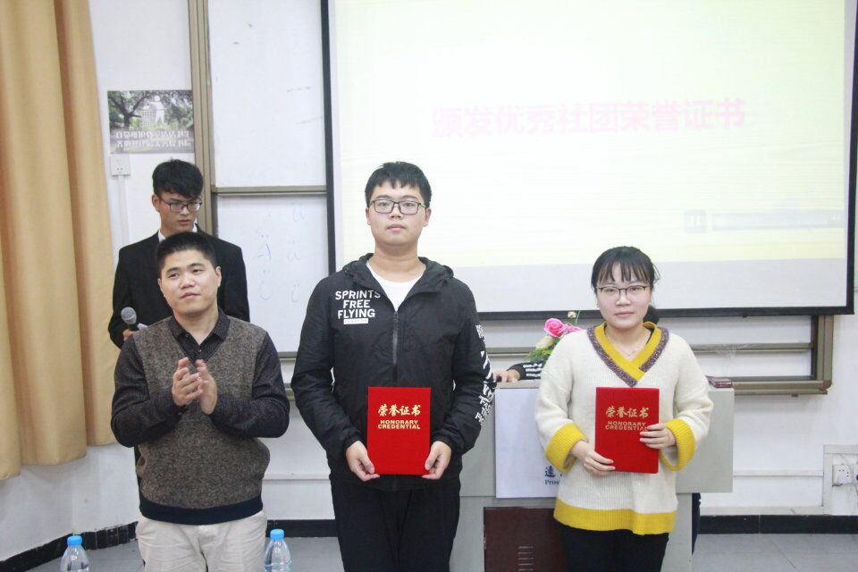 紧接着,由曾明珠副院长首先宣读了《远景学院2017-2018学年社团考核结果及表彰决定》的文件。社团考核既是学院对社团发展建设的引领,同时也是检验各社团上学年工作的成绩。对优秀社团及社团人给予表彰,是对他们在社团工作的付出最直接的肯定。精英之声等2个社团被评定为优秀社团、行走合川等4个社团被评为合格社团;陈超越等3名同学被评为优秀社长;李言等6名同学被评为社团活动先进个人。曾明珠副院长和汪宏宇老师对上学年考核优秀、合格的社长颁发了聘书,为社团活动先进个人颁发了荣誉证书并与同学们合影留念。