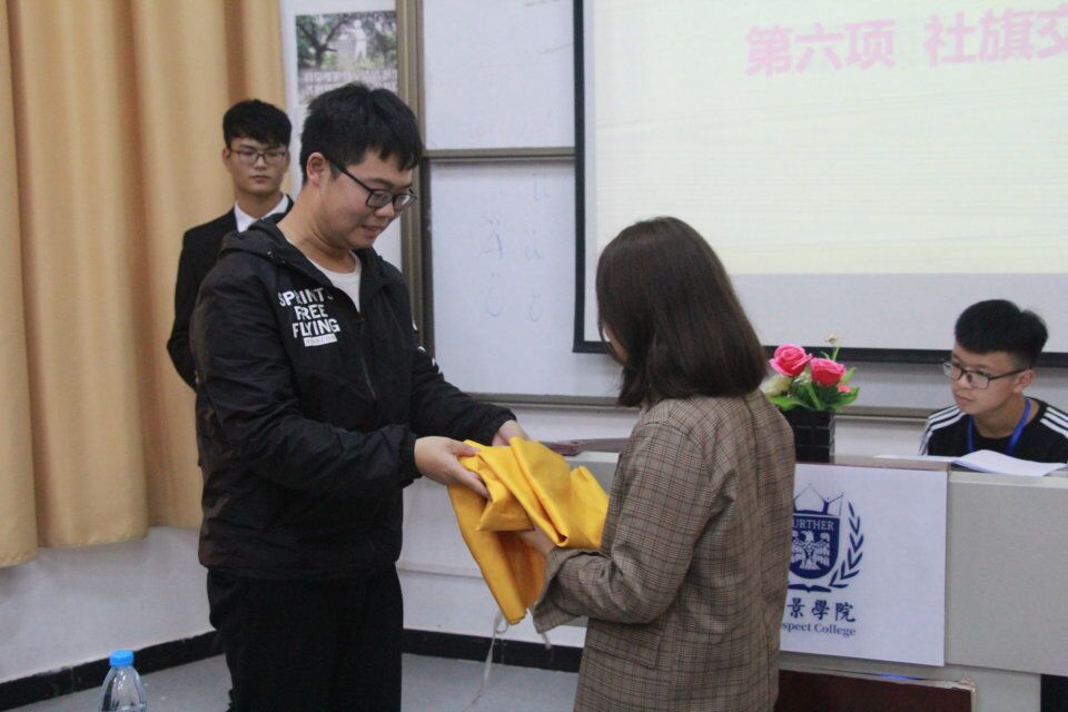 大会现场,各社团新老社长进行了隆重的社旗交接仪式,一面面社旗的交接,接过的是肩负社团发展的那份责任与担当,希望新任社团接班人们能够不忘初心,用心发展好远景社团,将远景社团的青春风采薪火相传。随后现任团总支学生副书记兼社团管理委员会会长梁兰代表全体二届三任为远景社团进行2018-2019学年社团工作展望,她简要回顾了各社团本学年的招新情况,紧接着围绕打造精品社团、巩固社团活动系统化建设、加强社团考核、树立创新意识等四个方面进行了阐述。她号召全体社团人,牢记远景社团“小而精“的社团发展理念,贯彻落实走社团“小而精”的路线,要使得每一位参与者在远景社团活动中都留下一段独一无二的回忆。她强调,要使我们的社团能在移通学院的百余社团中脱颖而出,成为我们远景学院乃至整个移通学院各个社团的楷模,不仅为每个社团自身争光,同时也为我们远景学院争光。