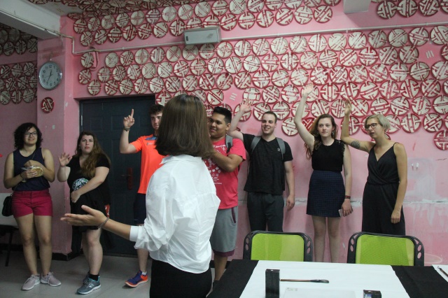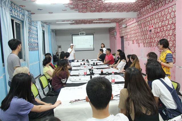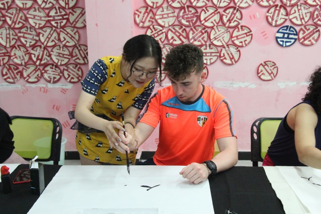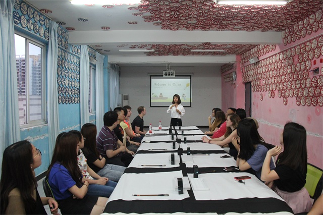 活动的第一项,就是教外国朋友写毛笔字。毛笔作为中国的文房瑰宝,能让外国友人比较深刻的体会到中华文化的魅力。首先唐智盟老师向外国友人介绍了摆在桌上的东西,“This a pen,but not a normal pen. In china we call it maobi(这不是平常所说的笔,在中国称之为毛笔)”这可能是大家第一次看到毛笔,都不知“如何下手”。在各自搭档的帮助下,外国友人握笔蘸墨,学习中国的笔画并一笔一笔地写出一些比较简单的字,比如:“人”,“火”,“水”等,其中最后一个是“远景学院”这四个字,对于不懂汉字的交换生来说,这四个字让不少外国友人无从下笔,虽然大家用毛笔写了几个字,但一下要写这么多字对他们来说还是比较困难。