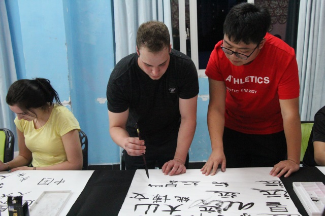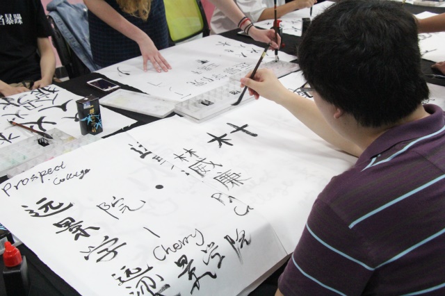 “这是什么意思?”一位之前来过远景学院的交换生用中文询问着。当旁边的同学给交换生解释意思的时候,他们都哇了一声,两个字的单词翻译成中文有四个字,这就是语言的魅力。一位交换生为了写好毛笔字,从座位上站了起来,这时同学们就将这四个字写下来,让交换生模仿,一些同学甚至教起了偏旁笔画“This is 撇 in Chinese”。“远景学院”NIU和ST.MARY的同学用不标准的口音边读边写。大家相互看着对方写的字,时不时发出笑声,也许写得不是那么工整,但是他们丝毫不会放弃,仍然坚持写下去。其中一位华裔交换生更是在宣纸上写上了自己的中文名字,“我写得好吗?”当他写完之后还用中文问大家。