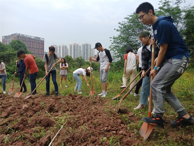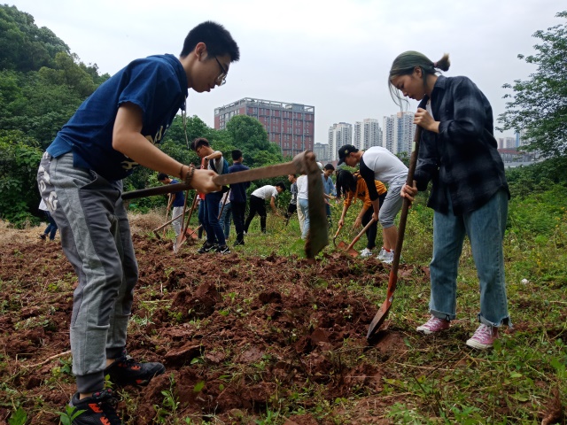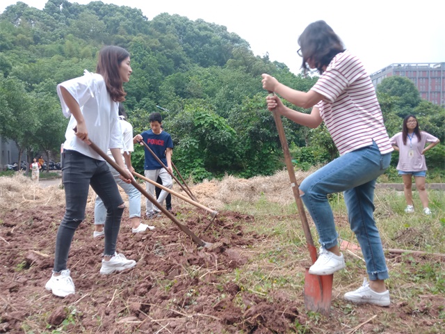 下午六点,两个部门的成员早早抵达了农耕地点远景农场,这里风景很美,走近细看会发现树上悬挂着颗颗嫩黄的枇杷,让人垂涎欲滴。这次我们主要任务是负责除草与翻耕土地。体育协会的同学率先开始了劳作,男生翻土,女生除草,不论性别不论年级,大家都全身心投入到了劳动中去。组织部的同学也不甘落后,一个锄头接一个锄头干得有模有样,没有丝毫懈怠,虽大多数同学之前都没有接触过如何翻土与除草,所以当遇到难题时大家会相互交流指导如何翻耕土地与除草。