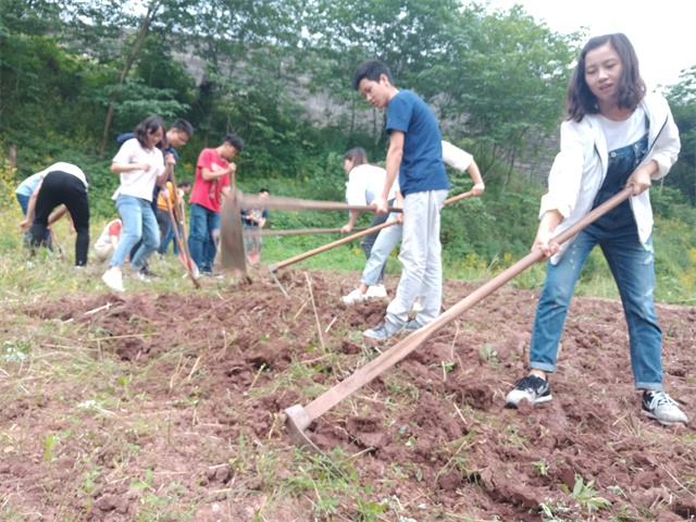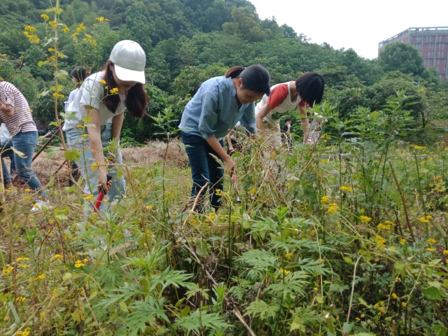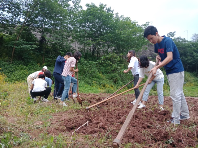 农耕进行到一半时,大家的额头上都结了一层密密的汗珠,手臂挽起衣袖。女生们想要试试男生手中的铁锹和锄头,男生们也接过女生手里的镰刀,耕地劳动就这样增加了许多乐趣。男生指导女生怎样翻土更省力,女生告诉男生怎么除草更快,农场里除了嚓嚓的劳动声也时不时传出大家的笑声,偶尔女生还会看见草丛里有一些不知名的小花朵,红的、黄的,被掩盖在绿绿的草丛下面,这是劳作的意外之喜。当然,不乏也有一些小虫子隐藏在草叶下面,所以在除草的时候需要注意力集中。快乐的时间总是过得很快,谈笑间农场已经被同学们收拾出来了一大半,虽然蚊虫猖獗,但是大家依然收获满满,脸上露出劳作后满意的笑容。