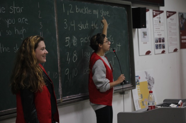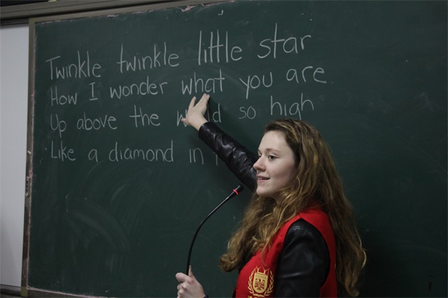 外教Rachel首先在黑板上用英文写好了第一首诗——《小星星》。她用比较有限的中文夹杂着英文,开始了她今天的课程:“你好,How are you?我叫Rachel,我是老师。”她每讲完一句,都会停顿下来鼓励小朋友们跟着她一起说。“Kelsey and I are gonging to teach you ‘twinkle twinkle little star ’in English”当然为了使小朋友们能够理解外教所说的每一句话,志愿者们也积极转变身份变成了临时翻译,给在场的每一位小朋友们服好务。