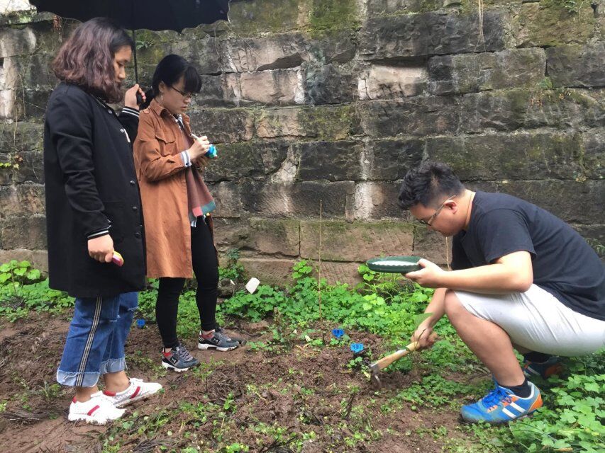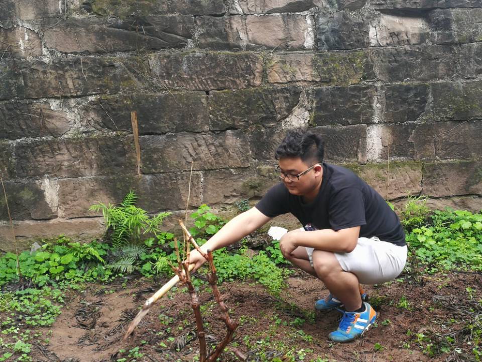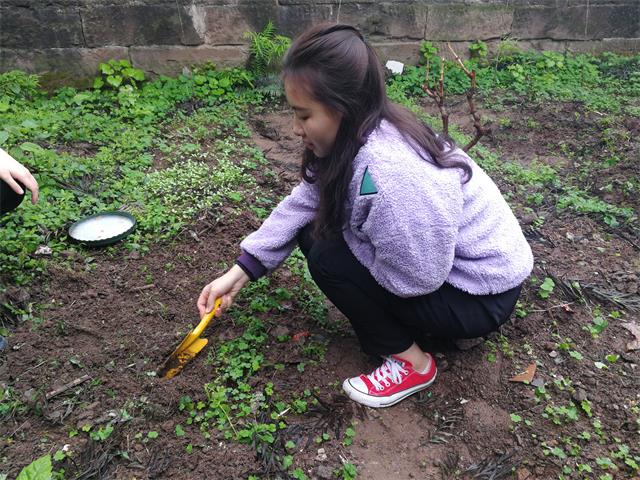 等到成员们都到齐了,径直走向后院,先用铲子把泥土翻新,再把混杂在土里的杂草清理干净将之埋到地里用作肥料。前几日种下的葡萄树蓬勃生长,银杏已悄然长出了绿叶,也许是近几天的阴雨绵绵,导致生长比较慢,如果连续的几个晴天,葡萄又会是另一番景象。重庆亚热带气候素有“一场春雨有春暖”,所以我们需要抓紧时间播下种子。