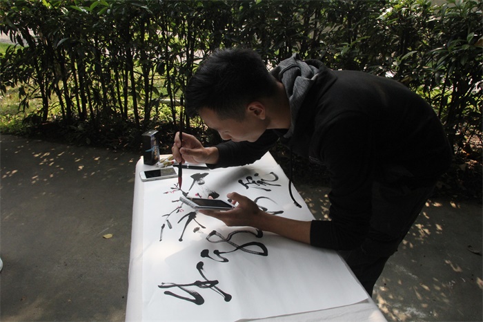 比赛激烈的进行着,选手们有条不紊的以自己脑中的想法进行着书法的创作。有的或在思考如何体现字亦画,画亦字的主题,而以团队名义参加的选手们新颖的书法创作更是层出不穷。虽然每个人都有自己对主题和内容的看法,但是把这些看法联系起来又是一幅又一幅富有创意的作品。为了与本次比赛主题“追本溯源——字亦画,画亦字”相契合,选手们都在创作上下了很大的功夫,更何况这次与以往的书法比赛的不同之处就在于:一幅作品中书与画两者缺一不可。