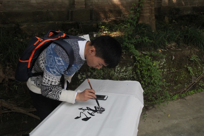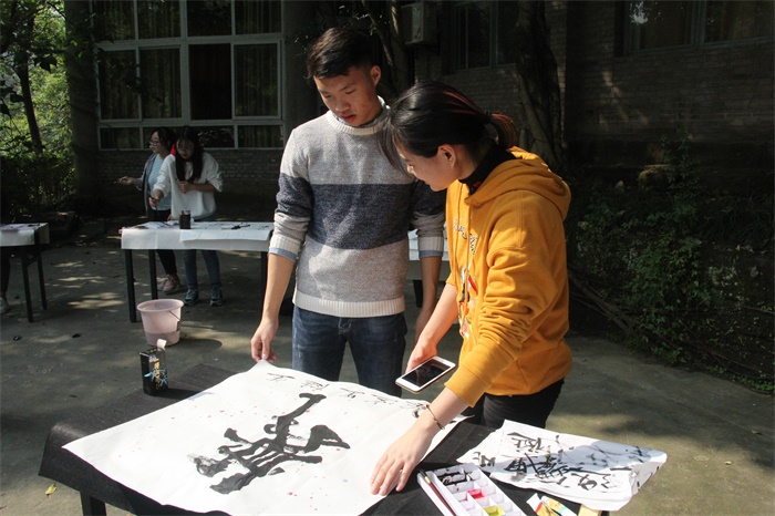 参加决赛的选手们各个都拿出了比初赛时更认真的姿态面对着这场群雄争霸的比赛,每一个人都想要充分发挥自己的水平,向着奖项奋斗着。决赛在中午十二点半准时书院的空地开始了,选手们有了初赛的经验,都提前准备好了自己所需要的毛笔、颜料以及自己的想法等。比赛中,参赛选手们,都对我们的主题有着不一样的理解,有的以字为主、山水画在一旁做点缀,有的用画来体现出字、并在一旁做出适当解释或批注,有的则是将两者完美地融合在一起。