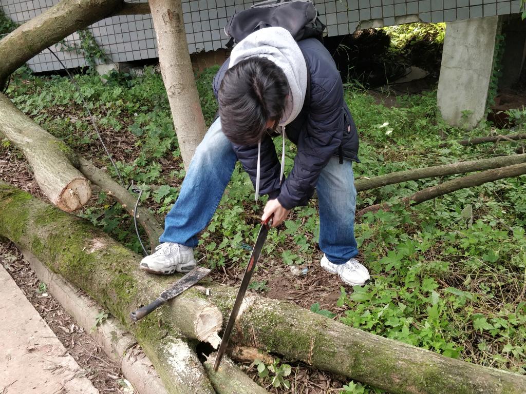 在农场里,还有些许的枯树横在田地里边,同学们在除完杂草后又拿上了锯子,和这些枯枝烂木开始了抗衡,不知是锯子不太锋利还是同学们不太会使用,, 但丝毫不减同学们的热情,锯子与树干仿佛弹起了协奏曲,在同学们的不懈努力下,本来粗长的枯干被分解成了数段,同时也将本来挡在小路中央的枯干逐一摆放整齐。