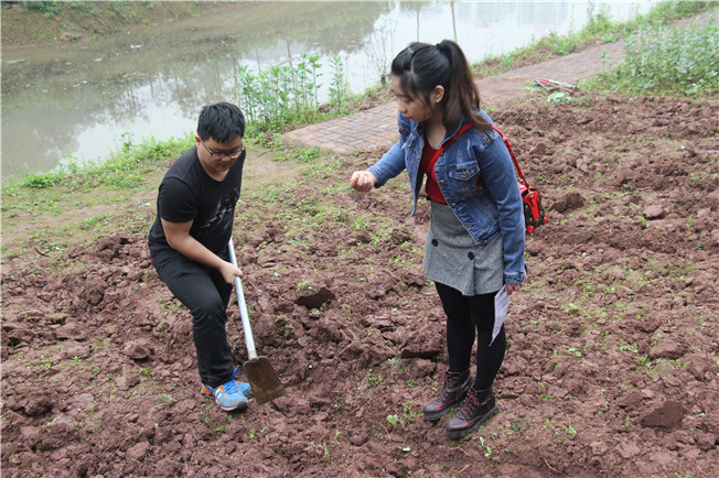 翻土,挖坑,放种,盖土。简单的几个步骤,队员们早在之前的劳动中熟知了。雨后的土还没开始发黏,反而是一种沉闷的松脆。翻土的队员们高扬着锄头,整齐地挖好一个个坑,女队员们把种子放入其中,小心翼翼把土盖好,压实。
