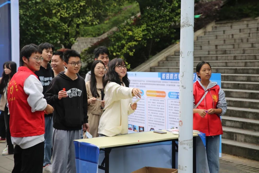 同时本次活动针对八大诈骗类型,分别设置不同的诈骗益智考验,通过定向打卡的方式,将防诈骗知识融入游戏中。在防骗加油站中,两位警官耐心解答同学们关于诈骗的疑问,帮助同学们拨开云雾,识诈骗。职场防诈活动中,重庆市合川区税务局工作人员来到现场为同学们讲解职场防诈骗知识;有趣的防骗翻翻乐中也考验着同学们的防诈骗意识,诈骗飞行棋将反诈骗常识与飞行棋巧妙结合,用闯关的方式获取防诈骗知识。本次活动超过千人参与,活动效果良好,让同学们在玩中学、学中乐、乐中学。