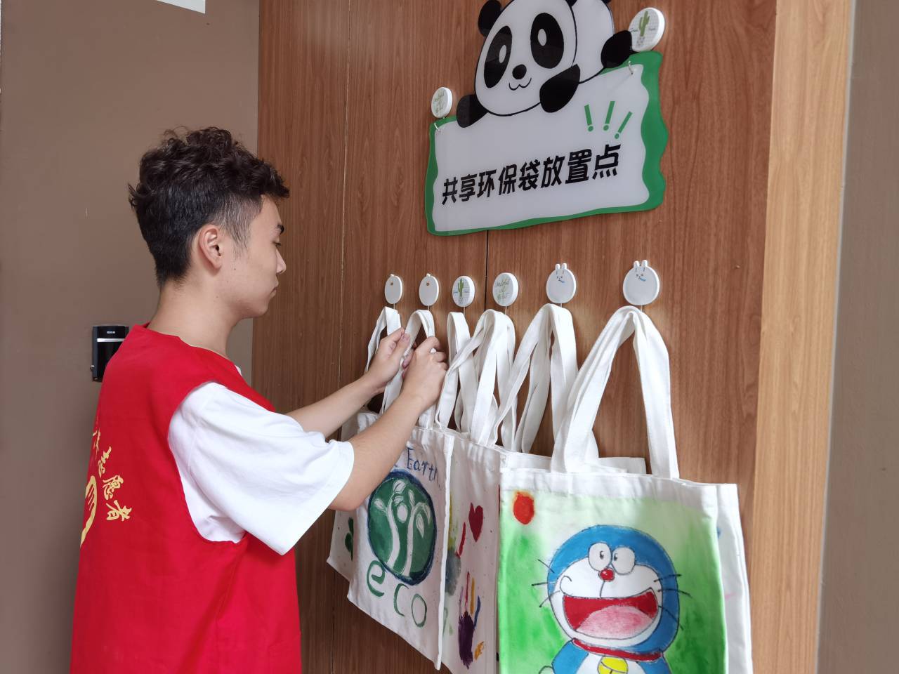 时间一分一秒,同学们的共享环保袋渐渐完成,志愿者们怀揣着对环境地敬畏之心将创作的共享环保袋挂置在远景楼、菩提书院、以及爱莲书院等四处醒目的地方,以便同学们在需要外出购物、装置书本、装置手提电脑时更加便捷的借用。