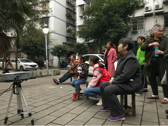 到达社区后,志愿者们立即开始布置场地,调试设备。中途由于电脑出现故障,导致电影无法正常播放,但负责设备的志愿者仍然有条不絮的架起了放映设施。