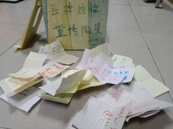 中午12点,志愿活动在C6楼下准时开展,志愿者们在宿舍楼下值班,等待同学们参加。不一会儿,来来往往的同学们就注意到这个活动,通过大致了解,他们踊跃地报名参加,经过一番思考,大家都将自己的烦恼写在纸条上,并把它们扔进盒子里面。随着参加人数的增多,箱子里面的烦恼也越堆越高。像“没有钱”、“长胖了”、“穷”这种物质的烦恼有很多,大家很想改变自己的现状;也有“最近学习压力太大”、“希望自己能过六级考试”等等关于学习方面的烦恼,可以看出同学们很希望自己的学习成绩能有所提高;“我觉得自己不能坚持”,关于这种个人方面的烦恼也有很多,同学们对此深有反思。看完大家的烦恼后,志愿者们希望大家的烦恼都会随着时间的流逝而烟消云散。