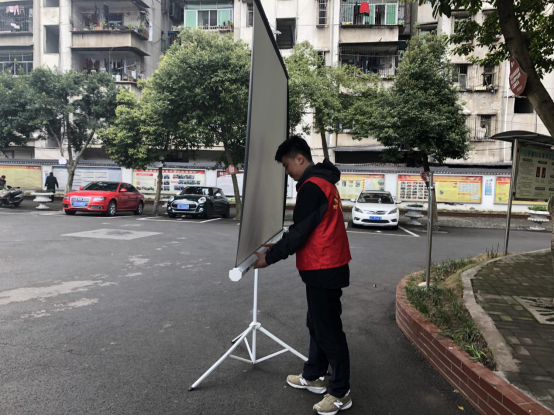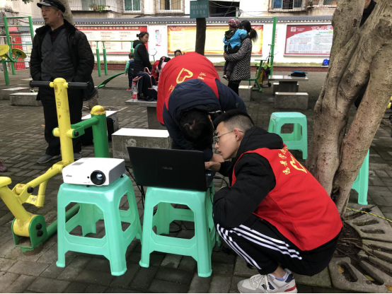 走进社区,我们开始场地布置以及设备调试。在调试设备的时候,由于电脑出故障,无法投影。在此焦急的状态中,参与此次活动的志愿者们,都保持冷静,大家协同将问题解决。