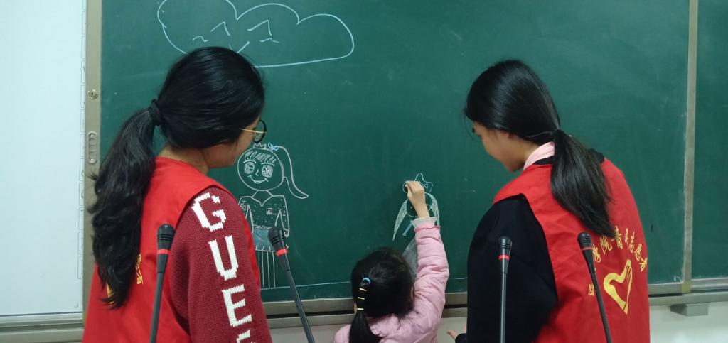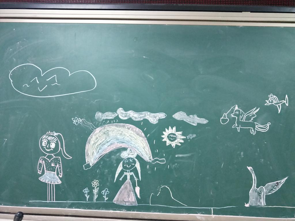 志愿者早早来到了社区等待小朋友,一个背着大大书包的小朋友走了进来,志愿者忙上前高兴地问道:“请问是刘雅昕小朋友吗?”小女孩儿羞涩地点点头,小手紧紧攥着衣袖,有点害羞。在互动中,小朋友和志愿者之间不再陌生,志愿者牵着她稚嫩的小手,一起在黑板上涂涂画画,经过大家的共同努力,在黑板上建造了一个美丽的“花园”。这个花园承载了这个小女孩儿美丽的公主梦,也寄托了她对未来的向往。