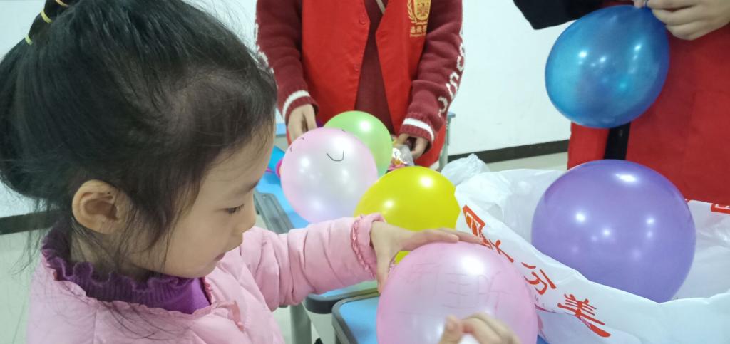 志愿者和小朋友一起吹气球,不一会儿就将一个个气球打得圆圆鼓鼓。看到那五彩的气球,小朋友兴奋地挑选了一个自己最喜欢的气球,并用画笔在上面写下自己的名字。当她写完名字将手中的气球高高举起的那一刻,志愿者感受到了她的喜悦,自己也十分满足。