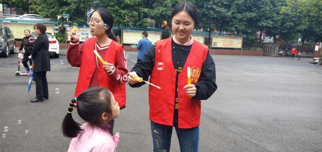 小雅小朋友嘟起小嘴,吹出了一连串的泡泡。美丽的泡泡四处飞舞,很快便吸引来了社区里的其他小朋友,他们在漂亮的泡泡下嬉戏。看到小朋友们开心玩耍的样子,志愿者们被深深感染,想起了自己的童年,也是像他们这般无忧无虑地嬉戏玩耍。情不自禁地迅速按下快门,将此时此刻的美好永远珍藏。