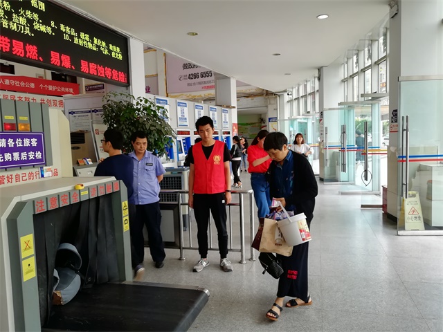 有志愿者协助车站工作人员负责安检,他们站在安检机前,努力保证所有的包裹务必都接受安检,他们耐心的提醒乘客小包也要安检,不要将危险物品带上车等等;有志愿者站在检票机前,为上车的乘客检票,他们耐心查看旅客的的身份证,确保检票工作的准确无误;还有的志愿者的志愿者负责车站内的指路,他们提醒旅客入口和出口不是一条通道,并为旅客指明厕所的位置,解决旅客的燃眉之急。